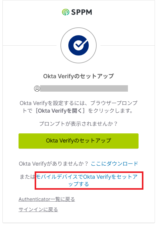 14.「Okta Verifyのセットアップ」画面でQRコードが表示されない場合、「モバイルデバイスでOkta Verifyをセットアップする」をクリックします。