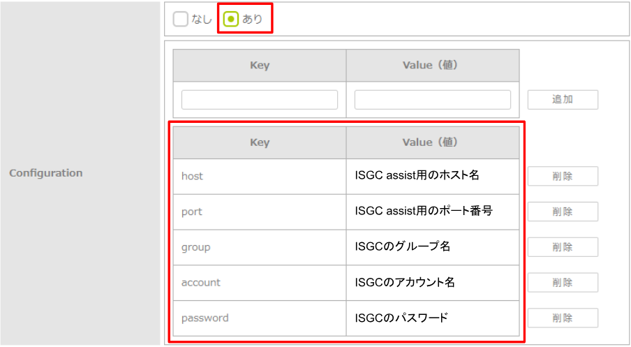 - ISGC assist に設定が必要な情報をSPPMから配布するため、ConfigurationにKeyとValueを設定します。設定が必要なKeyの値は「host」「port」「group」「account」「password」です。