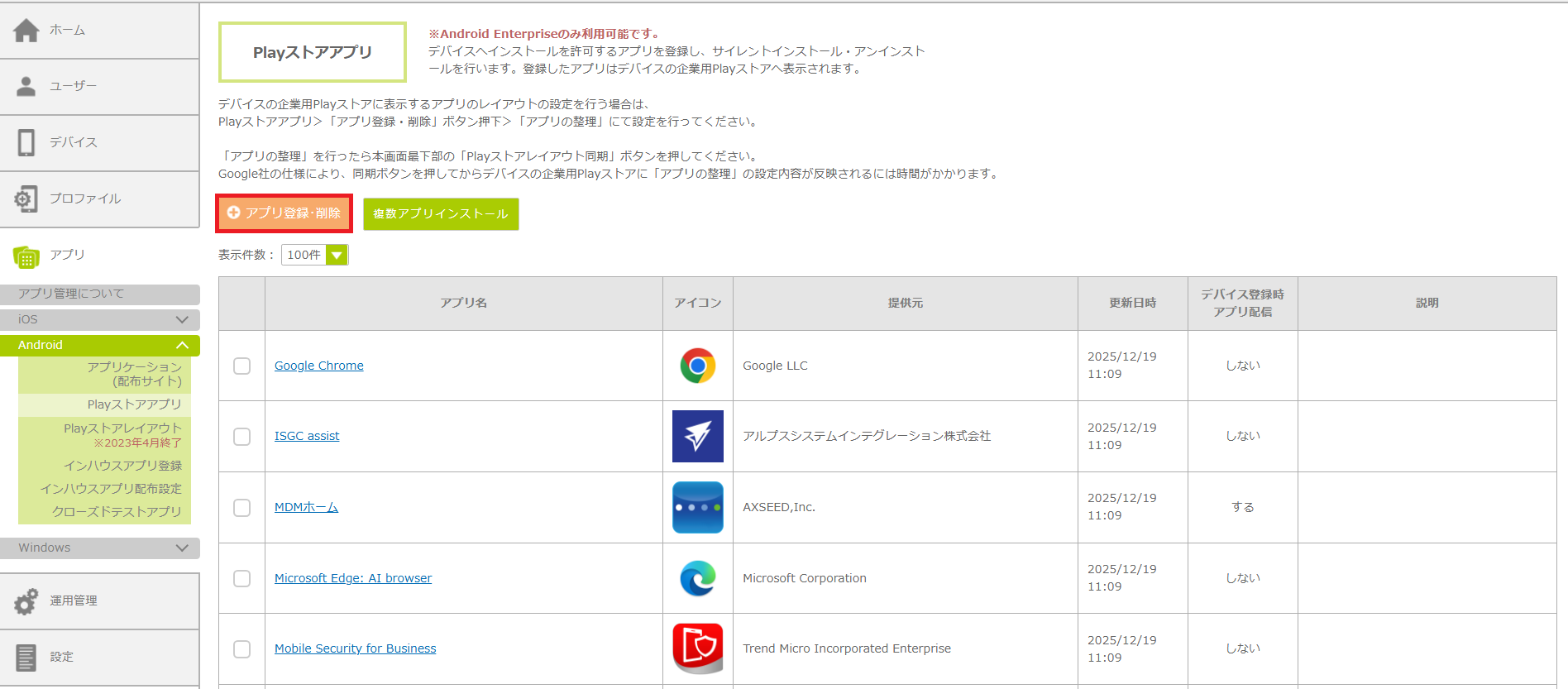 2.「アプリ登録・削除」ボタンをクリックします。