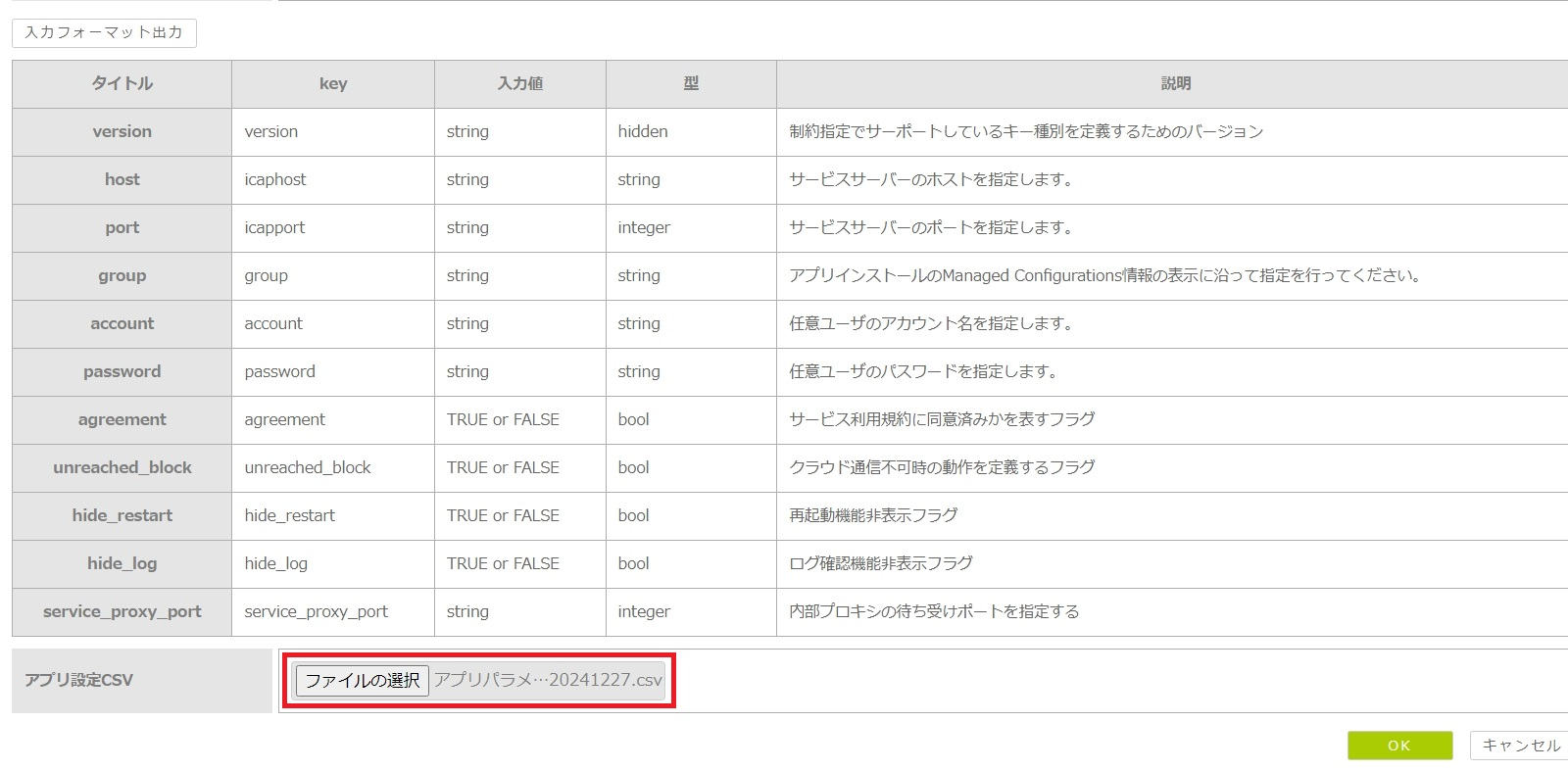 処理区分,tel,serial,version,icaphost,icapport,group,account,password,agreement,unreached_block,hide_restart,hide_log,service_proxy_port |