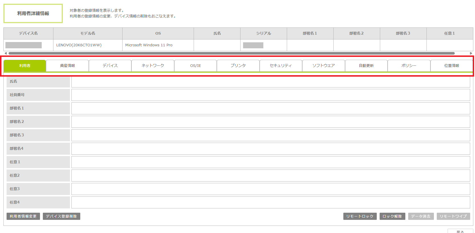 | 貸出部署 | デバイスの貸出部署が表示されます。 |