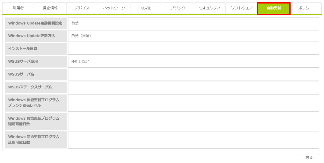 | WindowsUpdate自動更新設定 | Windows Updateの自動更新が有効か無効かが表示されます。 |