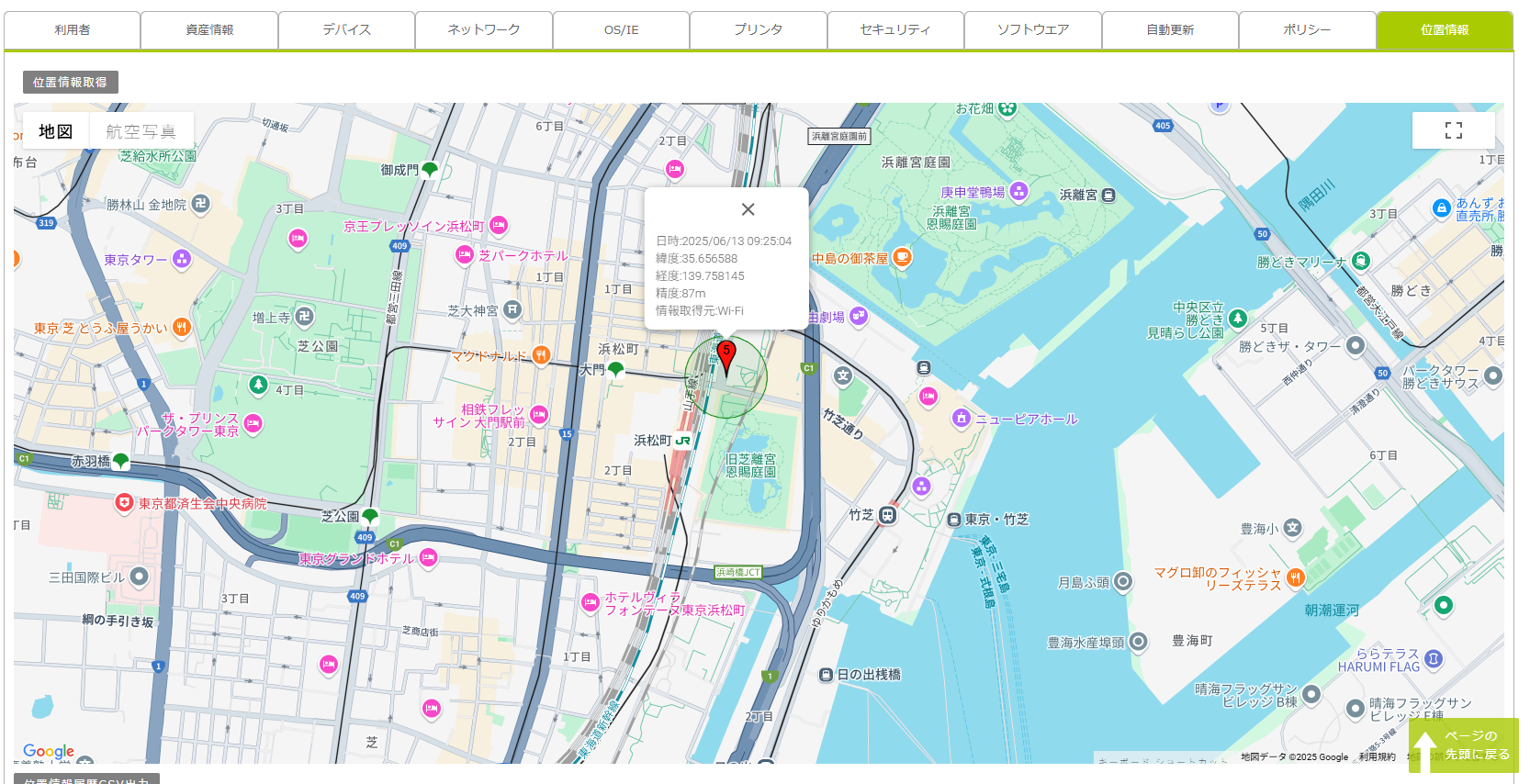 対象デバイスから取得したデバイスの位置情報が表示されます。
