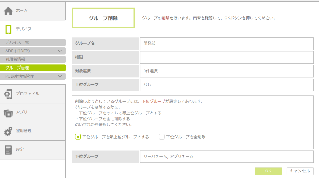 - 削除するグループに下位グループが設定されている場合は、下位グループの処理を「下位グループを最上位グループとする」または「下位グループを全削除」から選択します。